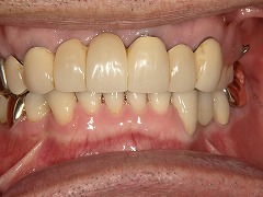 どんなお悩み | 他院で仮歯を装着済みであったが、インプラント以外でも治療が可能かどうかセカンドオピニオンで来院。義歯でも可能ということで、コーヌスクローネ義歯を提案。上顎は残っているかぶせ物を外して、二重に冠をかぶせて入れ歯をとめる義歯を制作(コーヌスデンチャー) 下顎はかぶせ物を外して、新たにメタルセラミック冠をかぶせてミリング義歯制作。 |