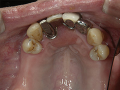 どんなお悩み | 他院で入れ歯を製作したが痛くて、いれていられない患者さん。 残っているかぶせ物を外して、残ってる歯に二重に冠をかぶせて入れ歯をとめる義歯を制作(コーヌスデンチャー) |